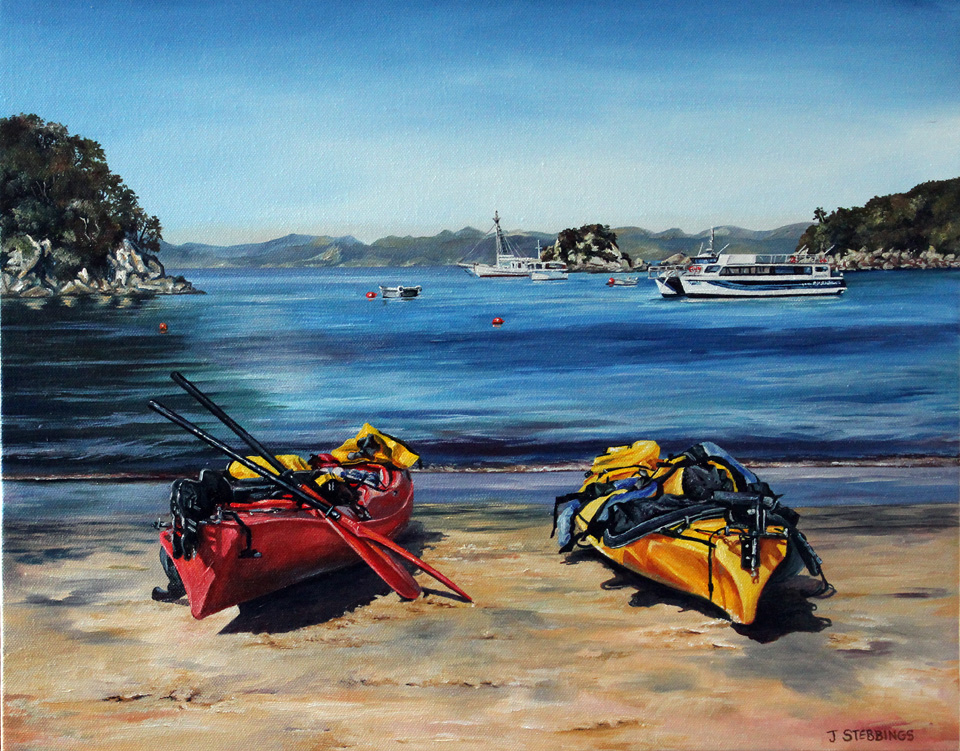 20" x 18" Oil on wrap canvas. Kayaks pulled up on Kaiteriteri Beach, Tasman Bay.