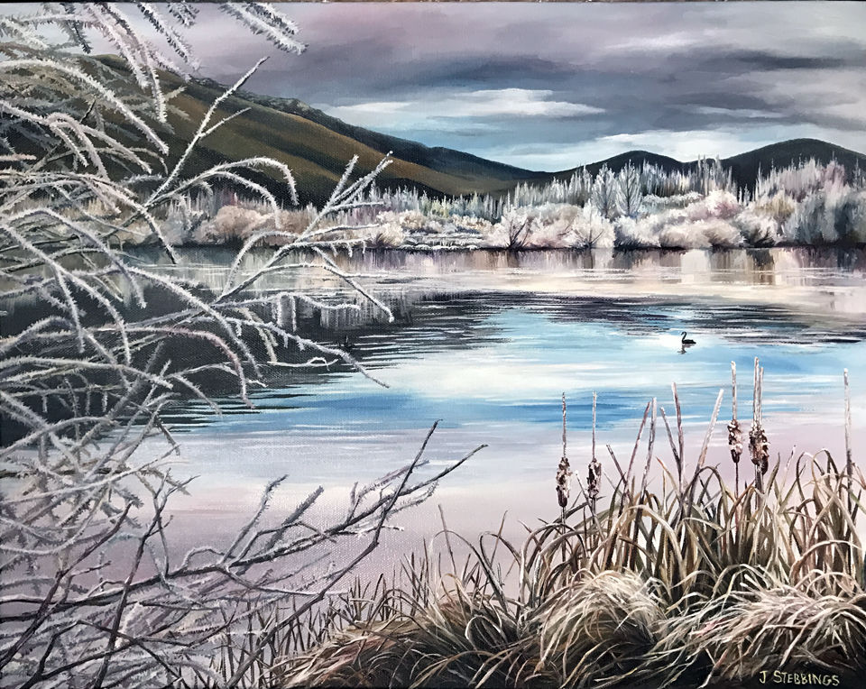 20" x 16" oil on canvas. A winter trip back to the same spot in Twizel.